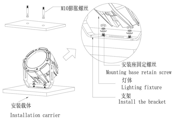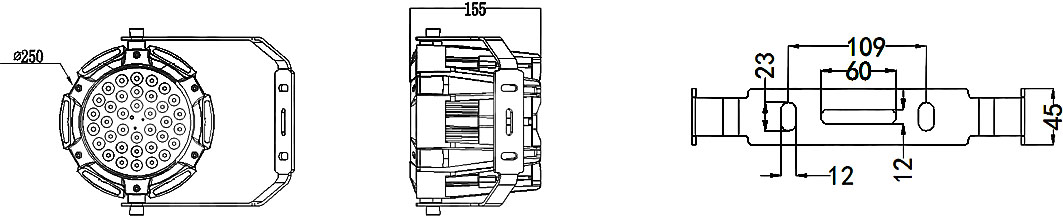 | 燈體材質: 壓鑄鋁+鋼化玻璃+沖壓支架+高效光學級透鏡 | 燈體尺寸: Φ250*155mm (可加遮光罩) | ||